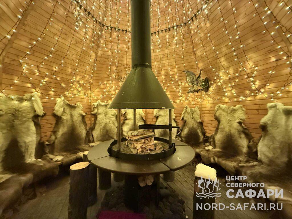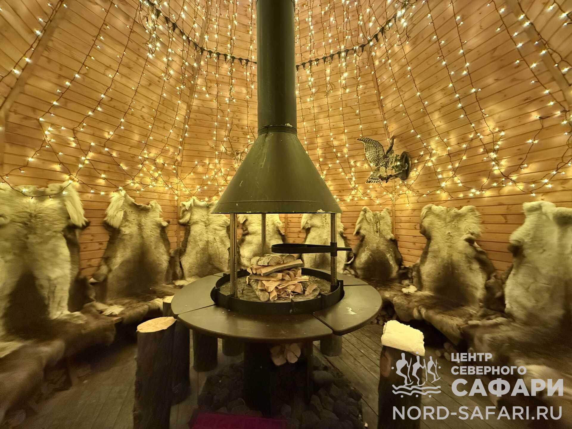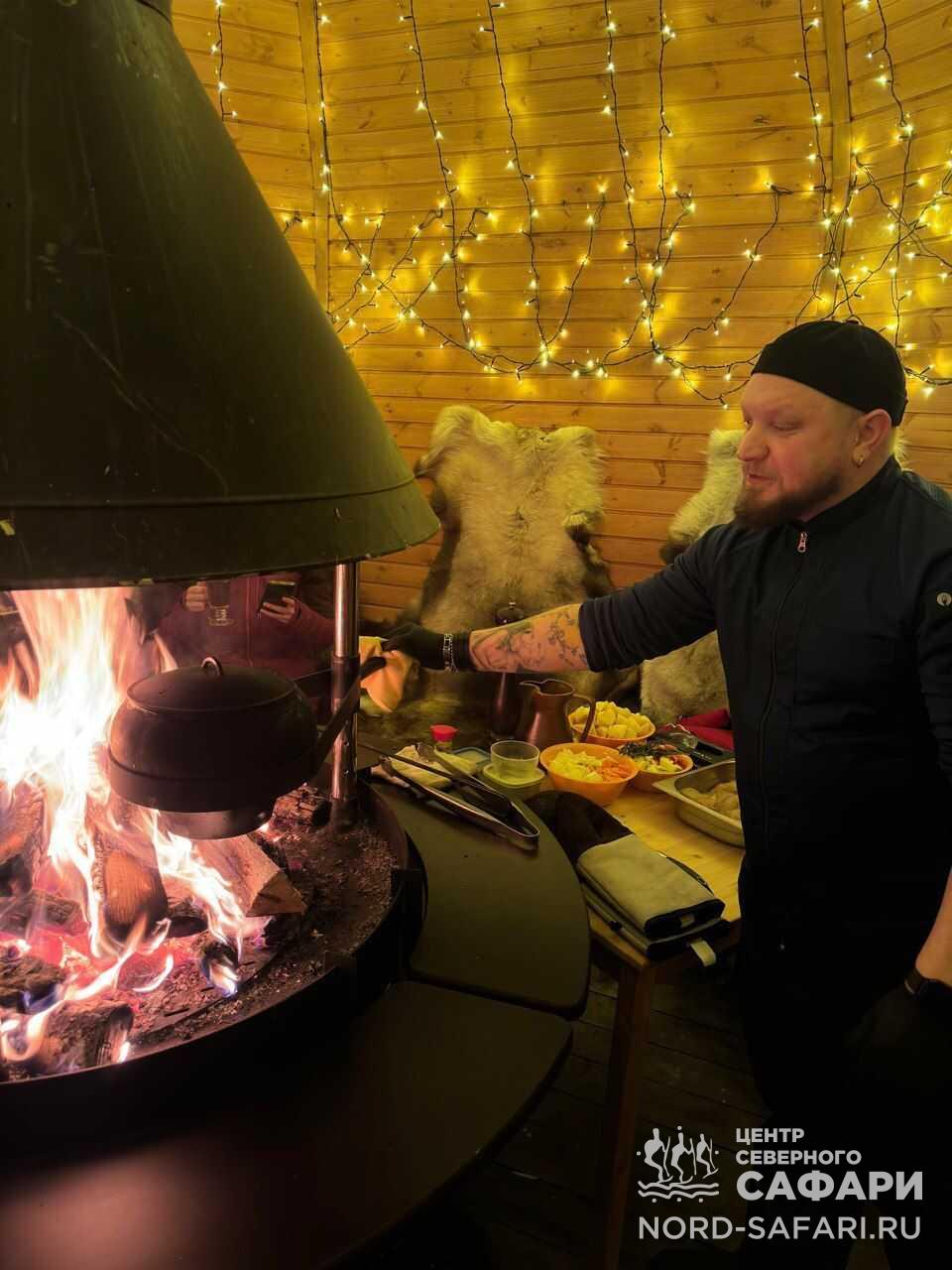 Обед путешественникам предложат в лесному чуме у открытого огня. Это отдых в дальней дороге, погружение в быт и традиции коренных народов Севера, аппетитный горячий перекус, приготовленный из локальных продуктов.