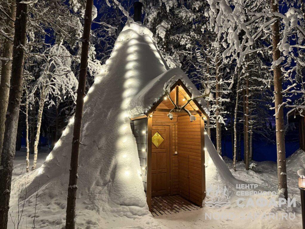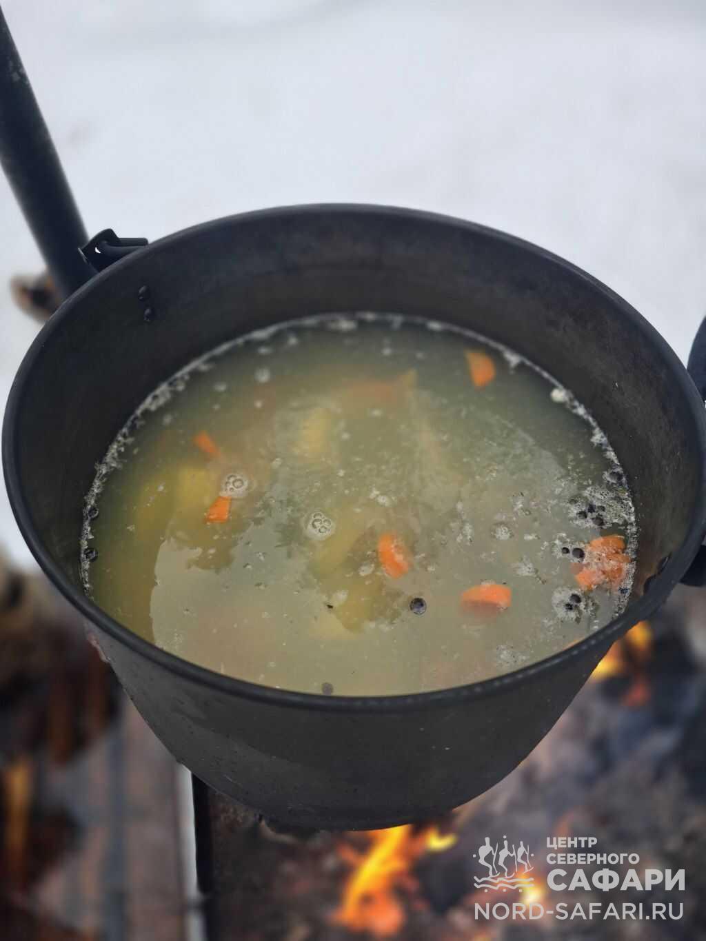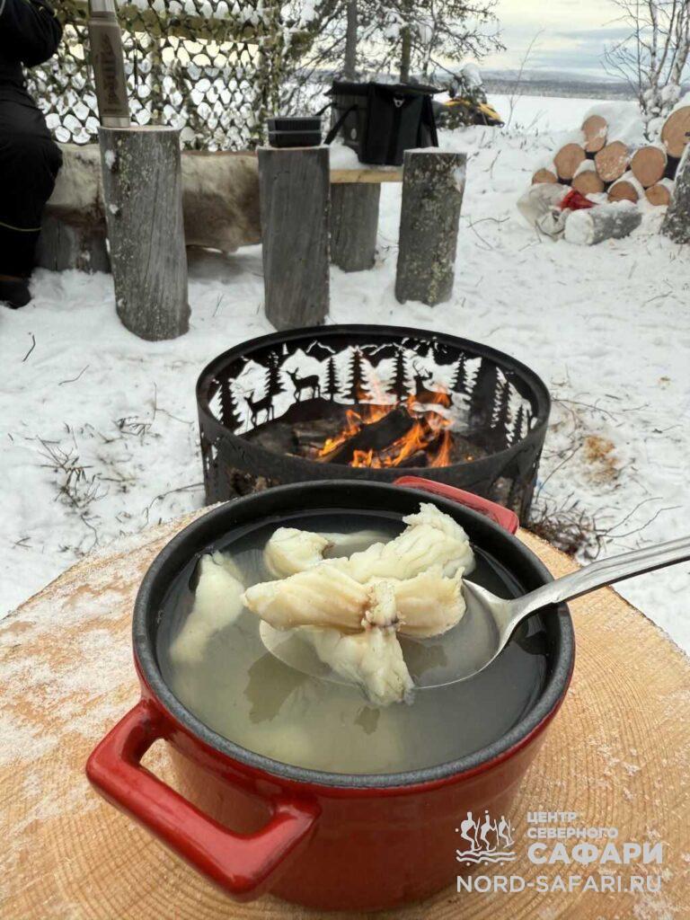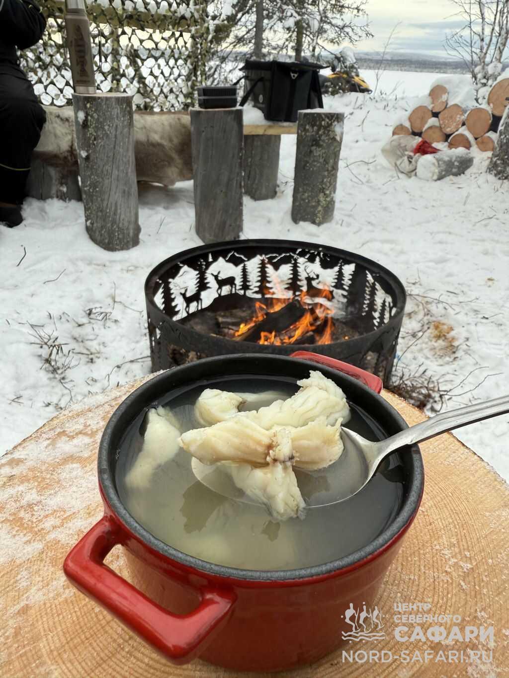 Обед путешественникам предложат в лесному чуме у открытого огня. Это отдых в дальней дороге, погружение в быт и традиции коренных народов Севера, аппетитный горячий перекус, приготовленный из локальных продуктов.