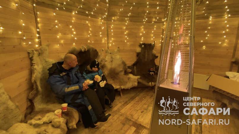 12.30 — возвращение в «Деревню чахкли». В уютном чуме для гостей приготовят горячий ароматный северный чай с аппетитным угощением. Здесь создана атмосфера волшебства и таинственности. Пахнет деревом, травами. Собравшись у огня, тут приятно согреться, поделиться впечатлениями и послушать добрую саамскую сказку. А непоседы могут поиграть у чума с фигурными снеголепами.