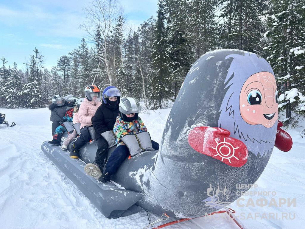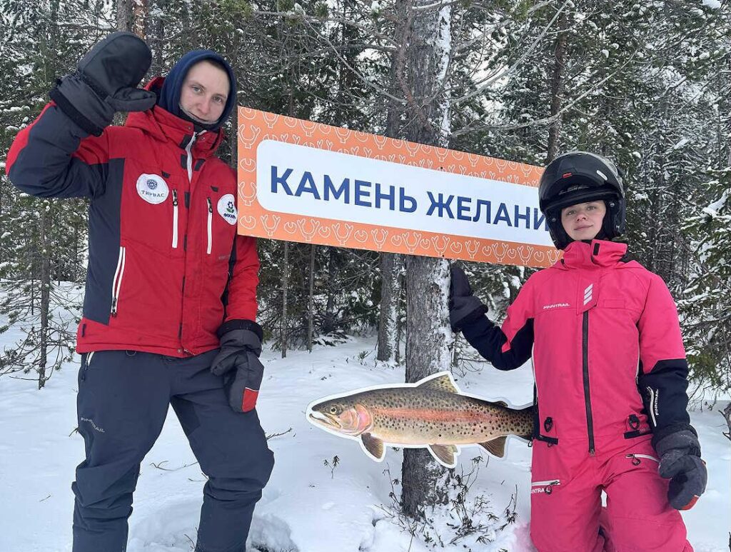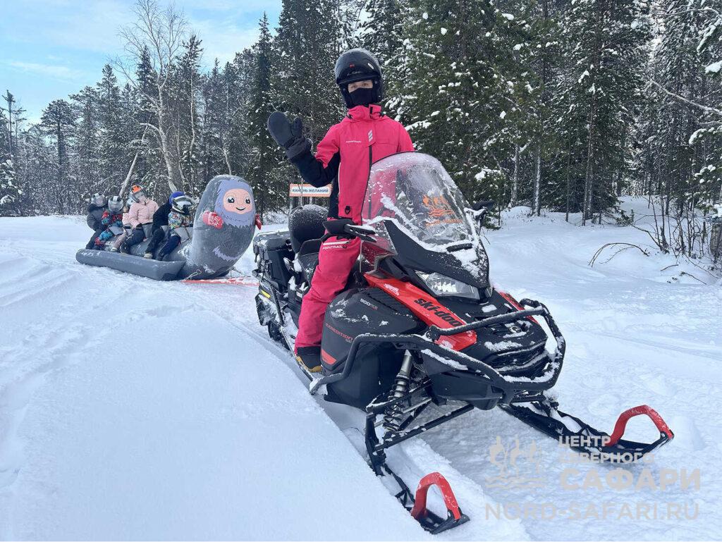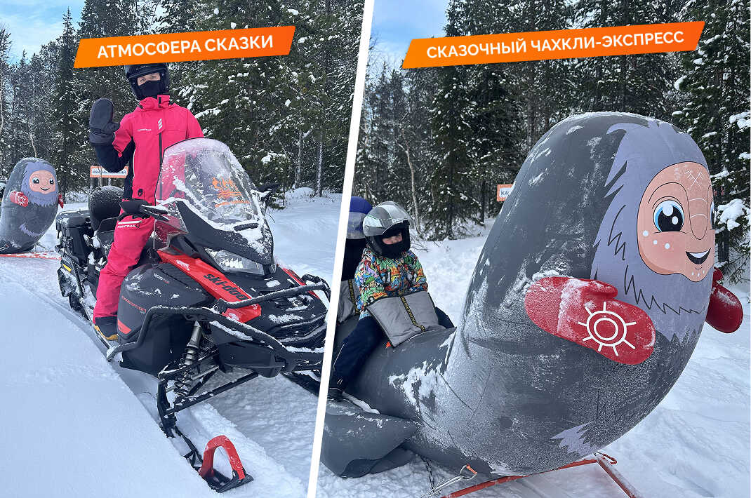 А тем временем к выходу уже подан сказочный чахкли-экспресс: снегоход и прикреплённый к ним сказочные сани с изображением улыбчивого чахкли. Занимаем места, проходим инструктаж — и в путь!