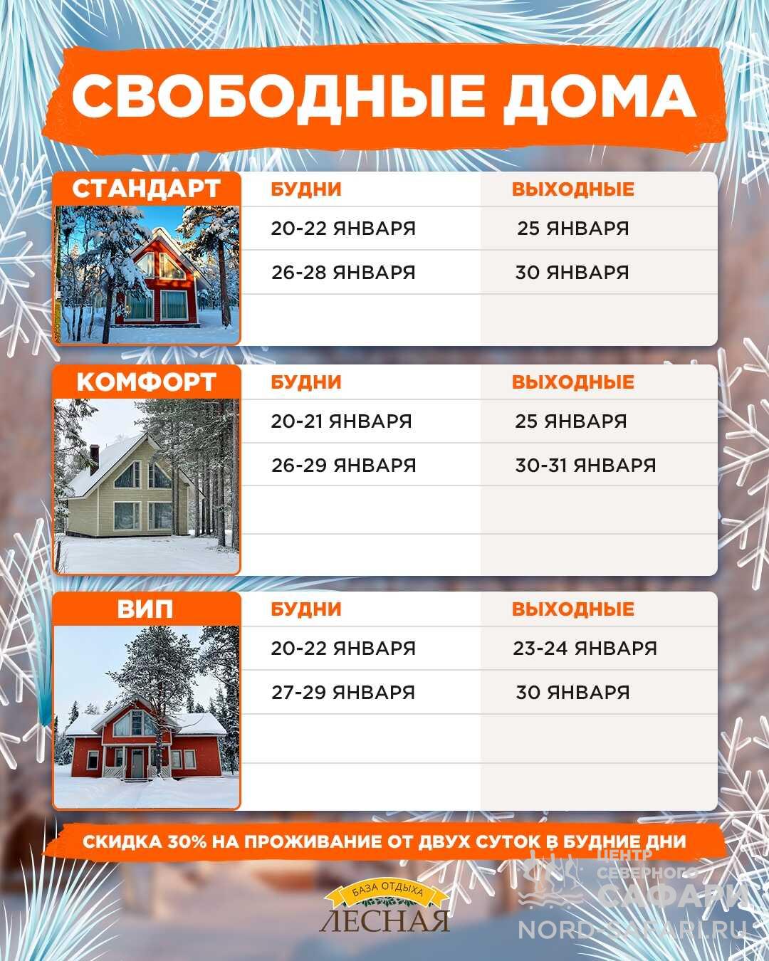 В будние дни действует скидка 30% на проживание от двух суток во всех категориях домов.