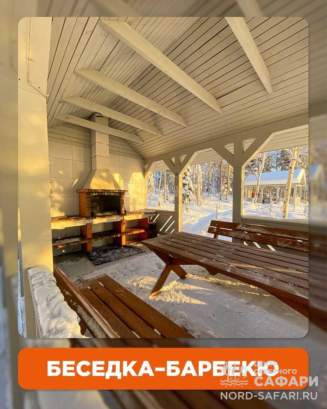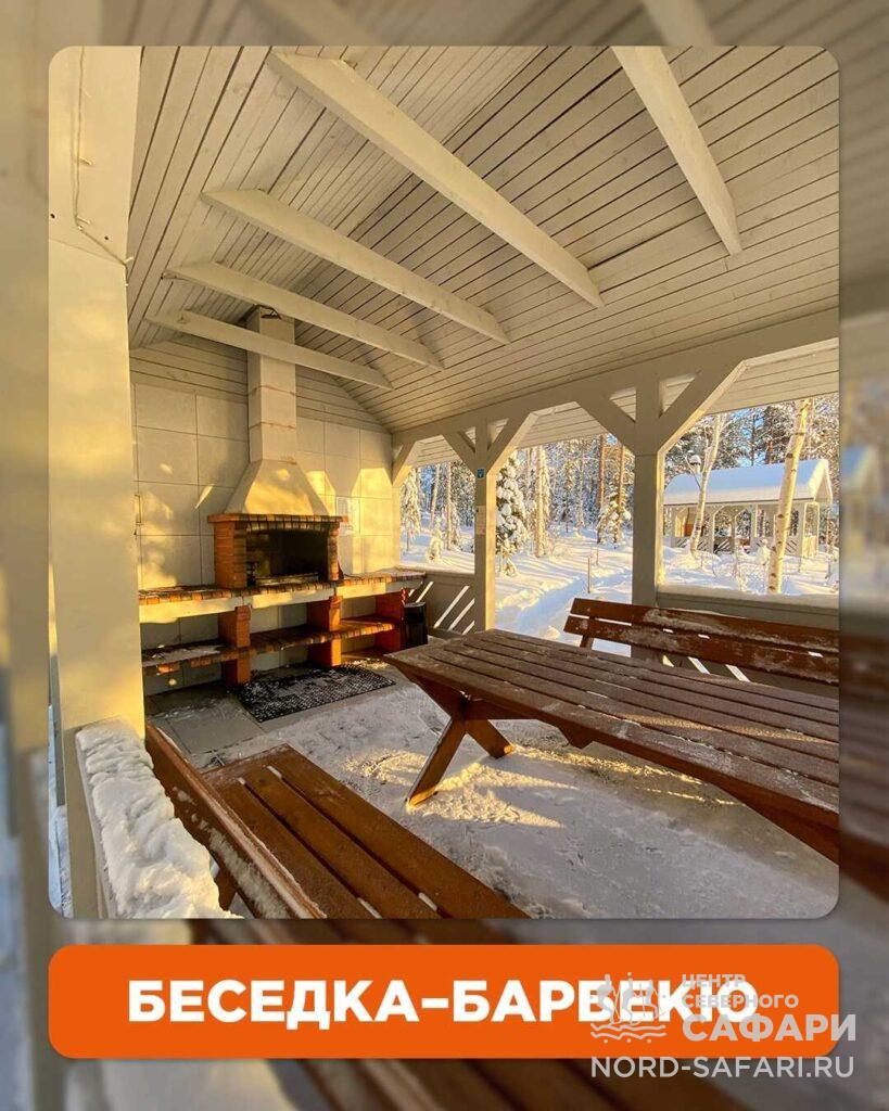 А также на территории базы: просторные беседки-барбекю, банный комплекс с тёплым бассейном и сауной, прокат зимнего инвентаря: беговых лыж и ватрушек.